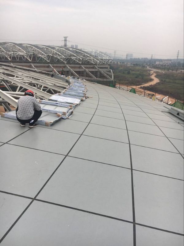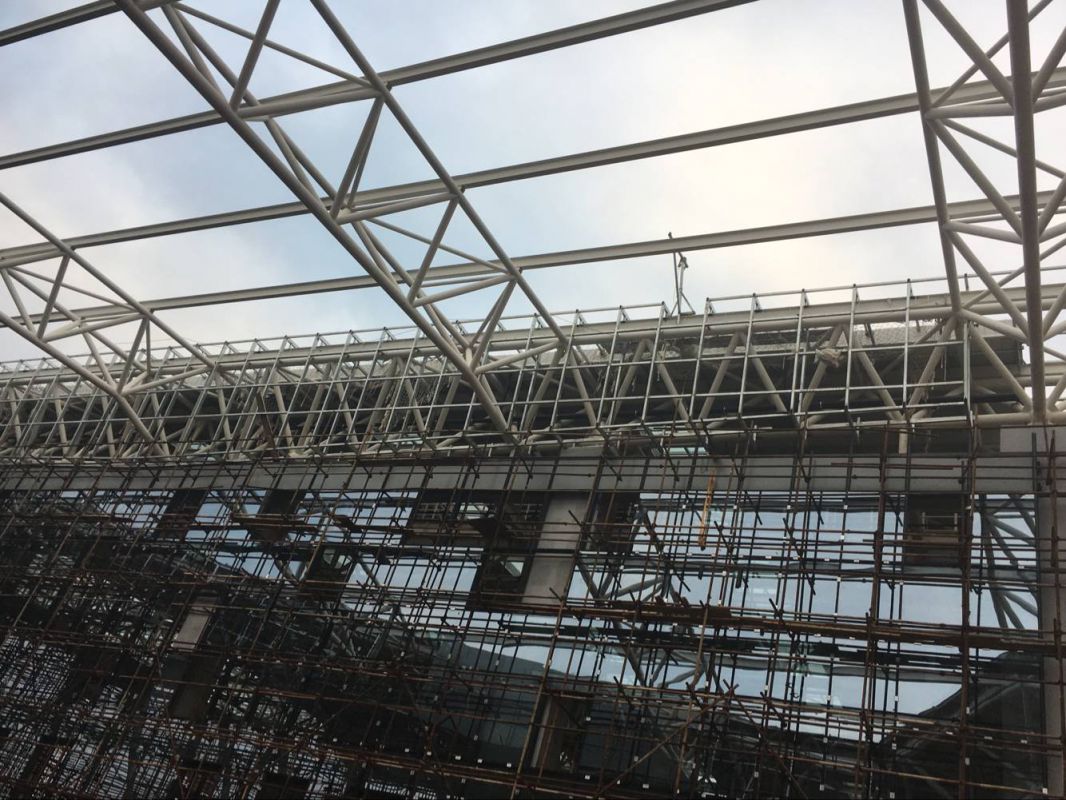 據(jù)悉,目前項目的屋面板、屋面天窗已基本完成;東面、西面、南面和與幕墻搭接的內(nèi)層鋁板骨架已完成;東面和西面的鋼格柵已完成;東面、南面、西面的上層的鋁單板已完成。